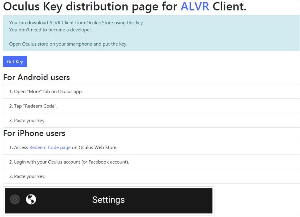 まずはOculus Key distribution page for ALVR Client.